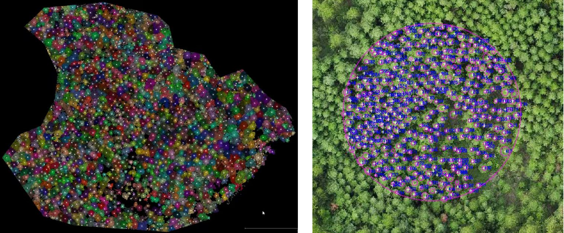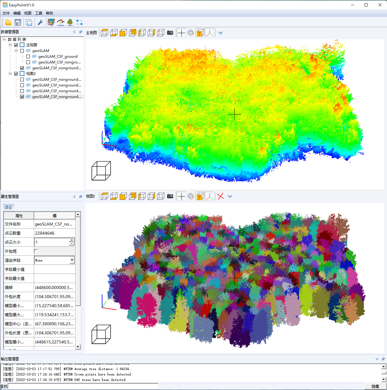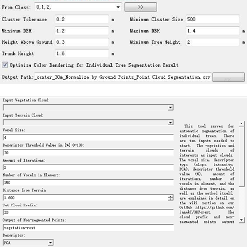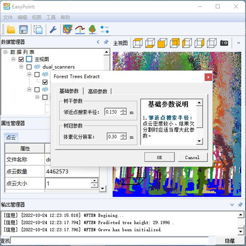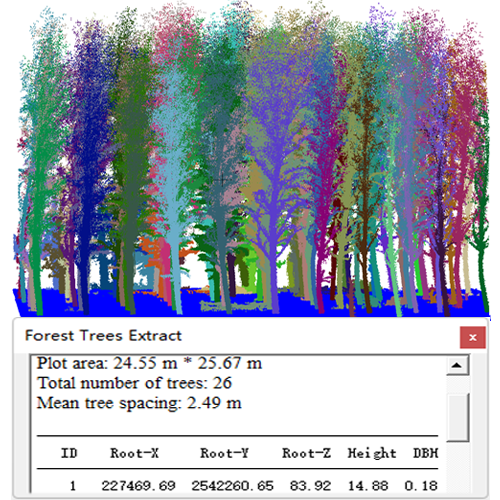 EasyPoint森林样地点云处理功能参数少且易于设置,实现单木分割、树干提取、参数提取(位置、树高、胸径、冠幅)等,整个过程全自动化,并以可视化和表格方式呈现结果。
