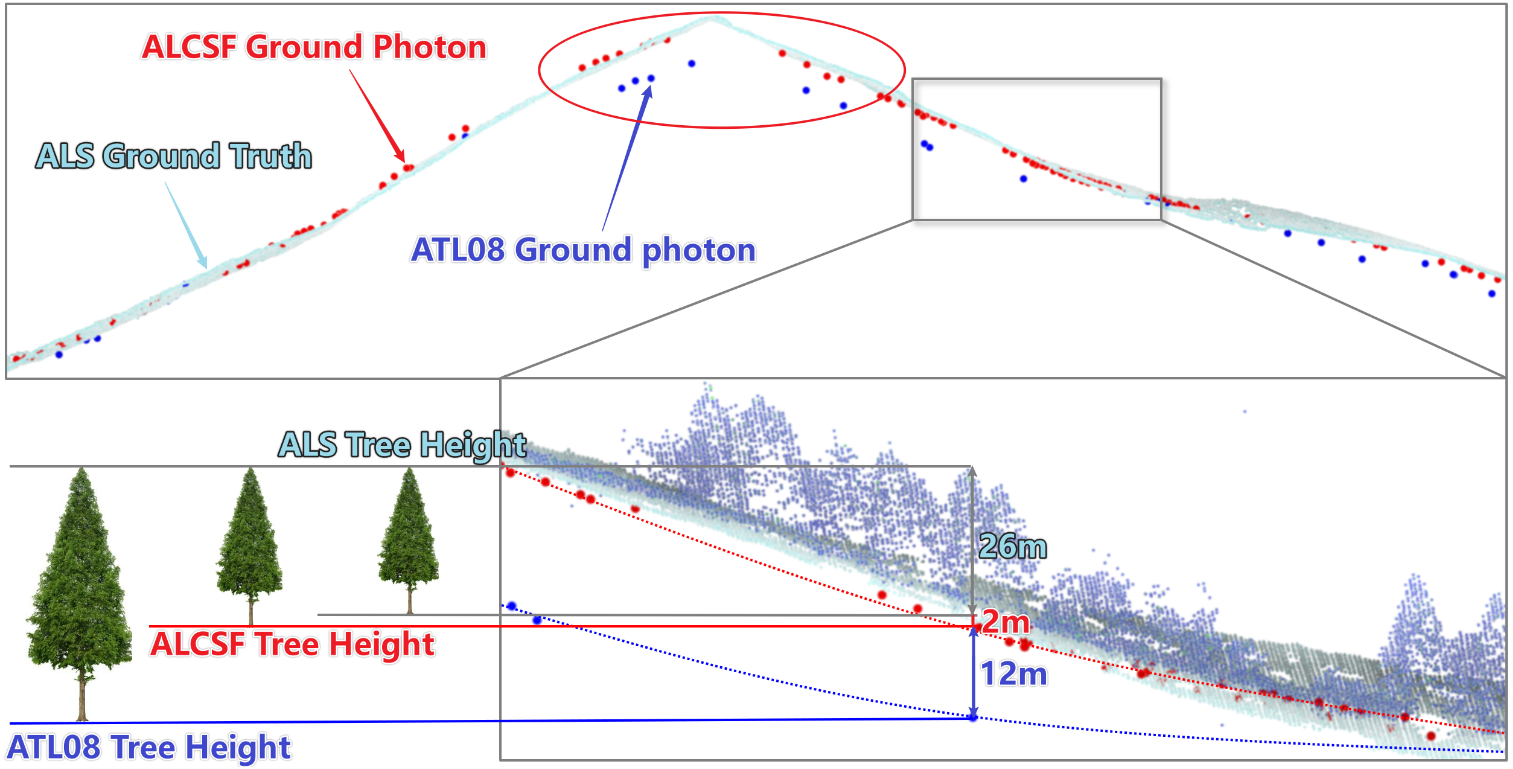 上述常规地面滤波不适用于星载光子计数(单光子)激光雷达ICESat-2,EasyPoint星载版则可实现从单光子点云中提取地面和冠层信息,精度显著优于NASA官方产品,更好的支持森林管理和碳储量估算等应用。